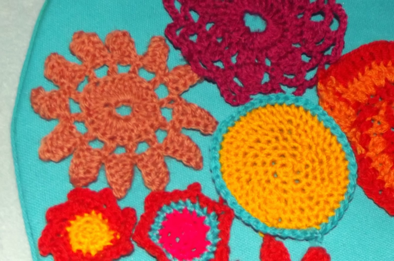 | round cushion cover made up with plenty different flowers & round grannies |