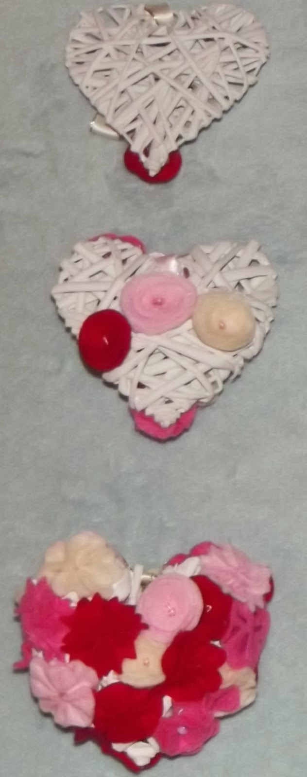 Projekt numer trzy: bez specjalnych niespodzianek... Walentynki nadciągają! Wiklinowe serca w różnych rozmiarach, całe pokryte filcowymi kwiatuszkami oraz, oczywiście - ocieplacze na kubeczki :)